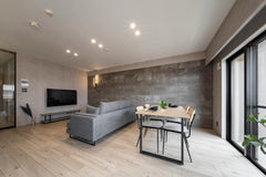 <淡いグレーのモルタル調で上品なダイニングキッチン。>