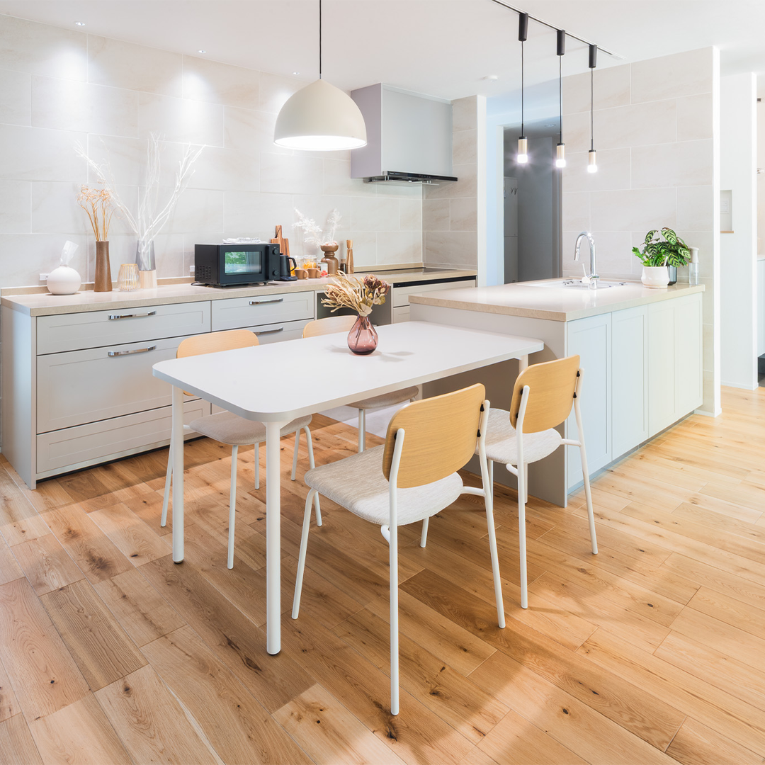 テーブルと同じ塗装カラーをチェアにも使っており、セットでお使いいただくと自然と一体感のある空間が生まれます。