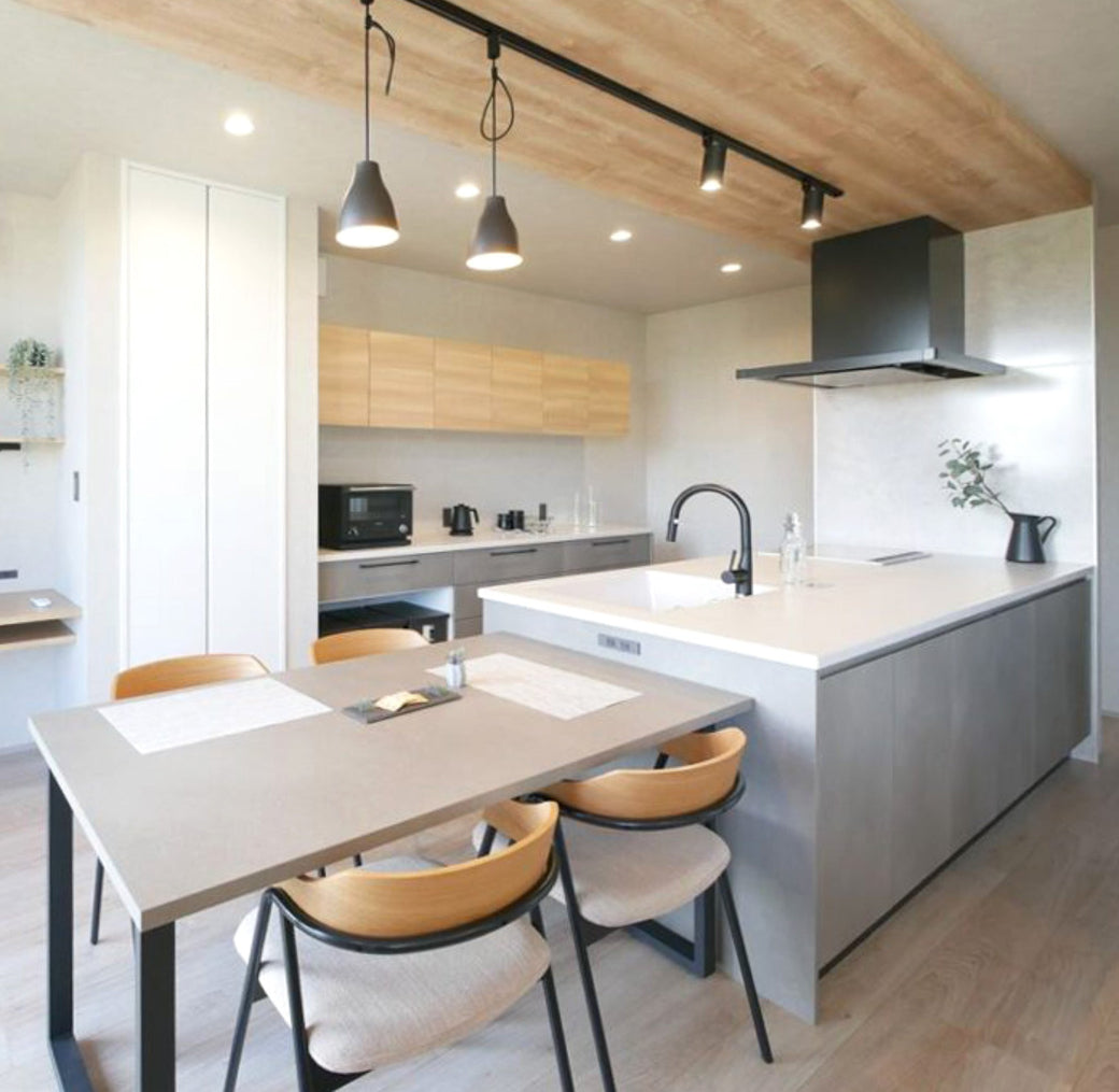 天板をキッチンのデザインと揃えてオーダーすることで、まるでオーダーメイドしたかのようなDK空間に。