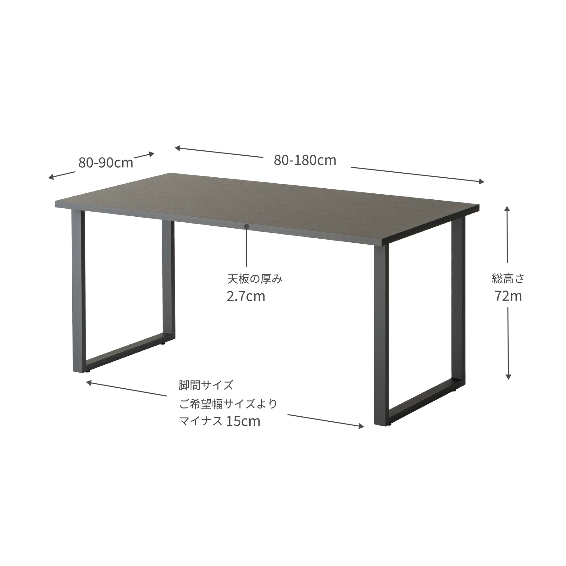 幅80-180cm × 奥行80-90cm × 高さ72cm(天板・脚総高さ) / 天板厚:2.7cm