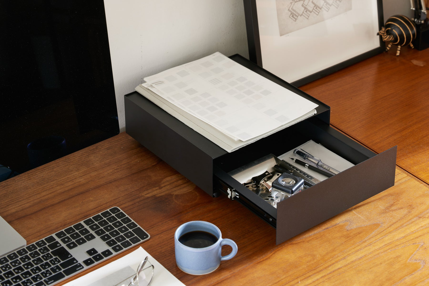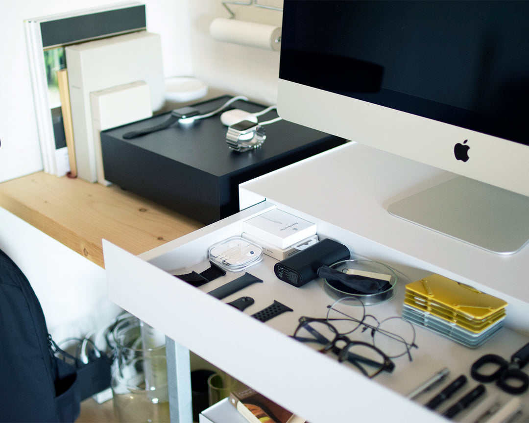 天面にはPCモニター、作業が終わったらキーボードやツールは引き出しへ。仕事がはかどるスマートな作業環境を作り出せます。