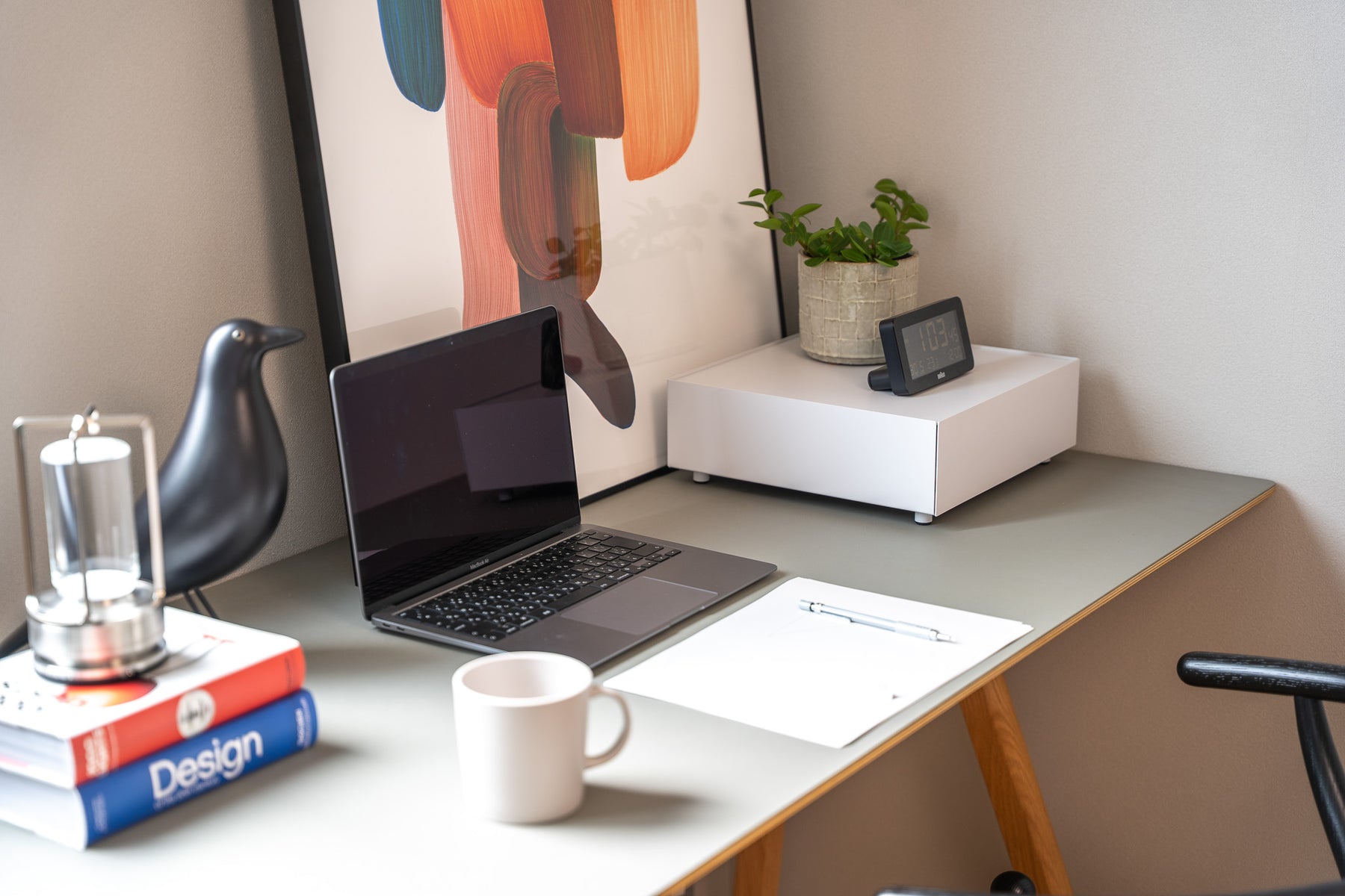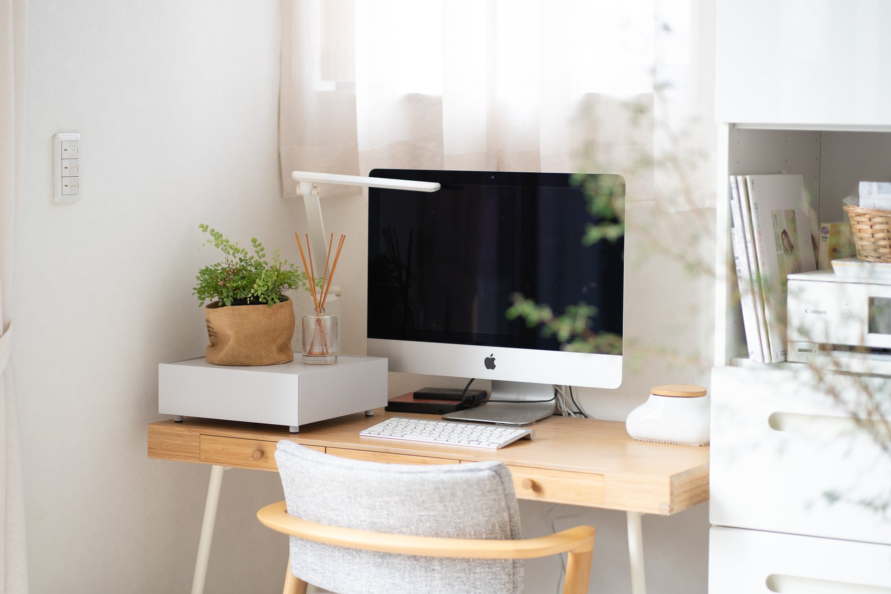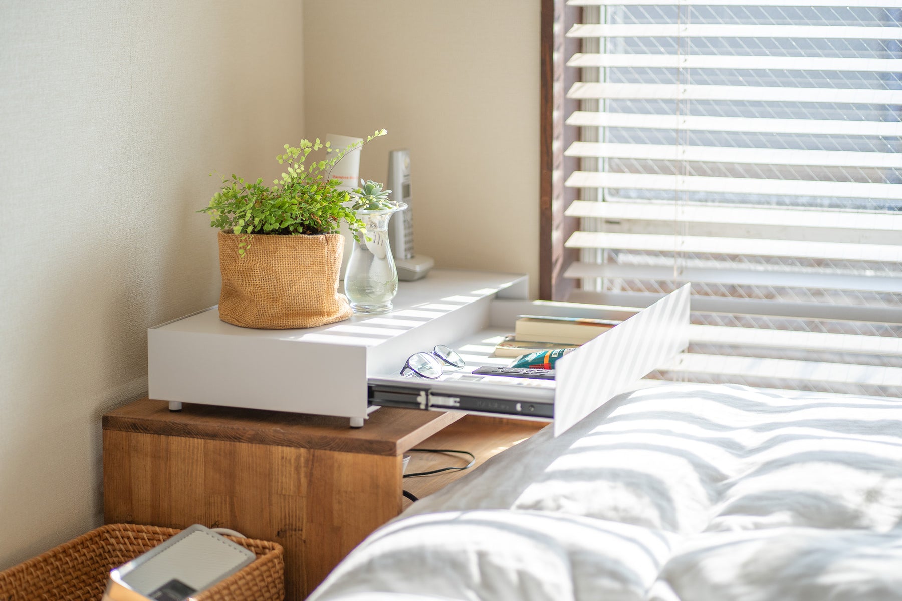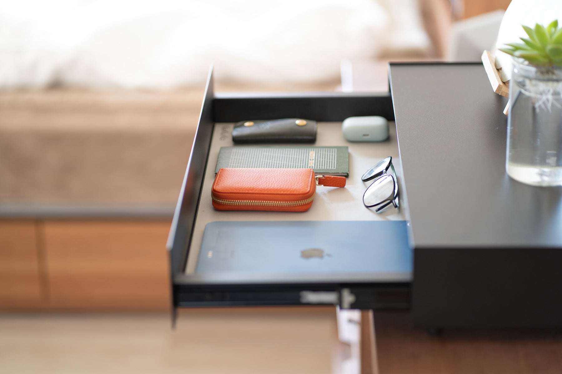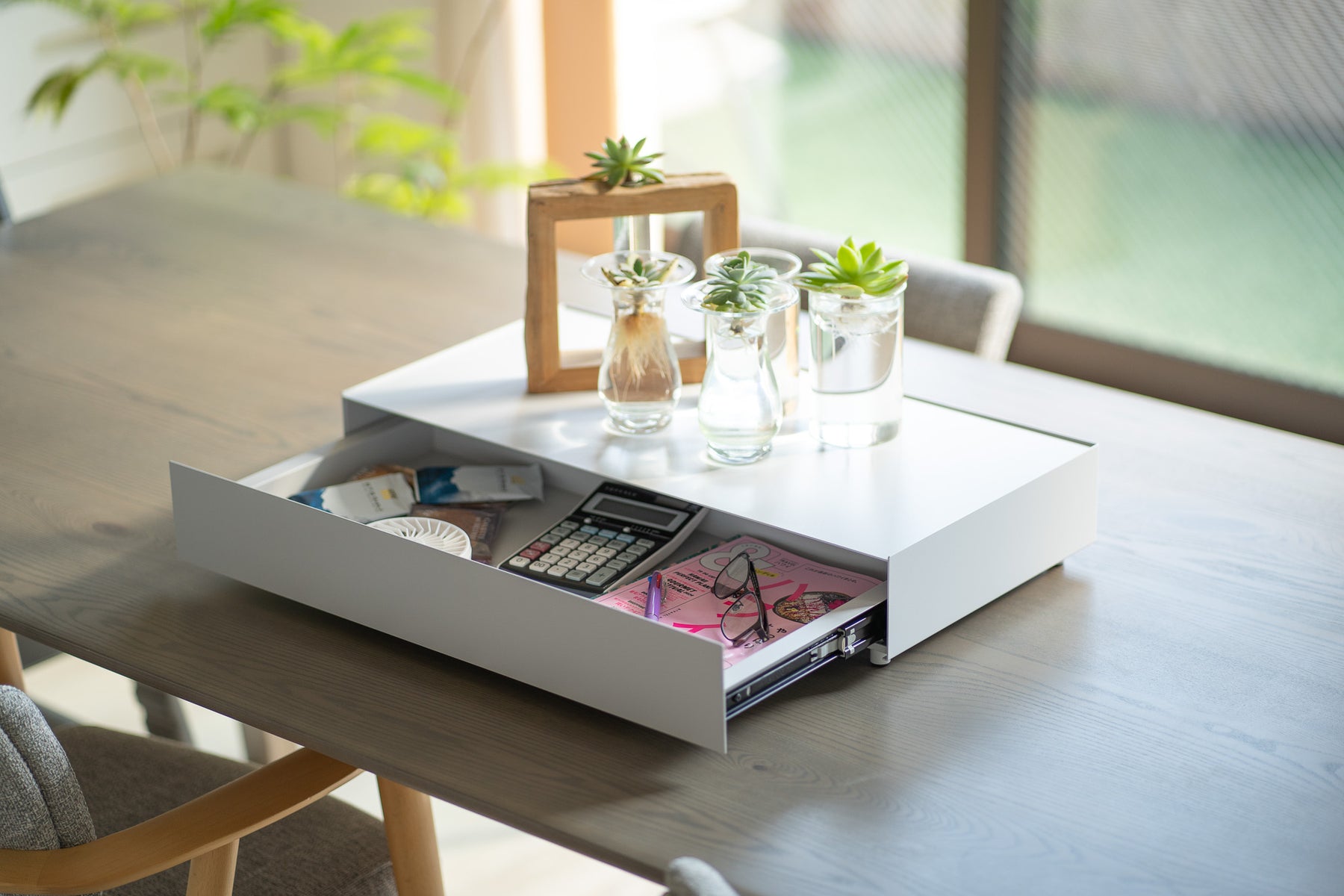 天面にはお気に入りのインテリアをディスプレイ、日常の細々した物は引き出しへ隠して収納。シンプルなデザインが空間に溶け込み、すっきりと整理された印象に。
