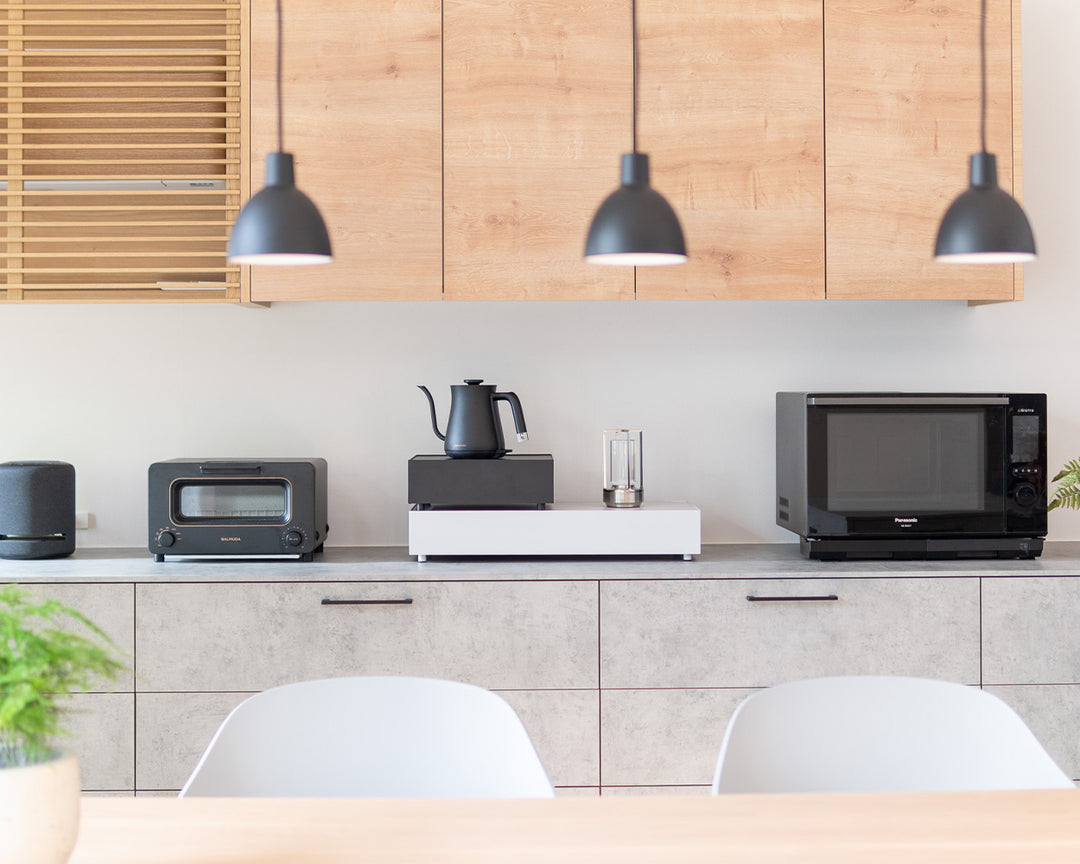 天板の裏に補強が仕込まれているため、キッチン家電も安心して設置可能。