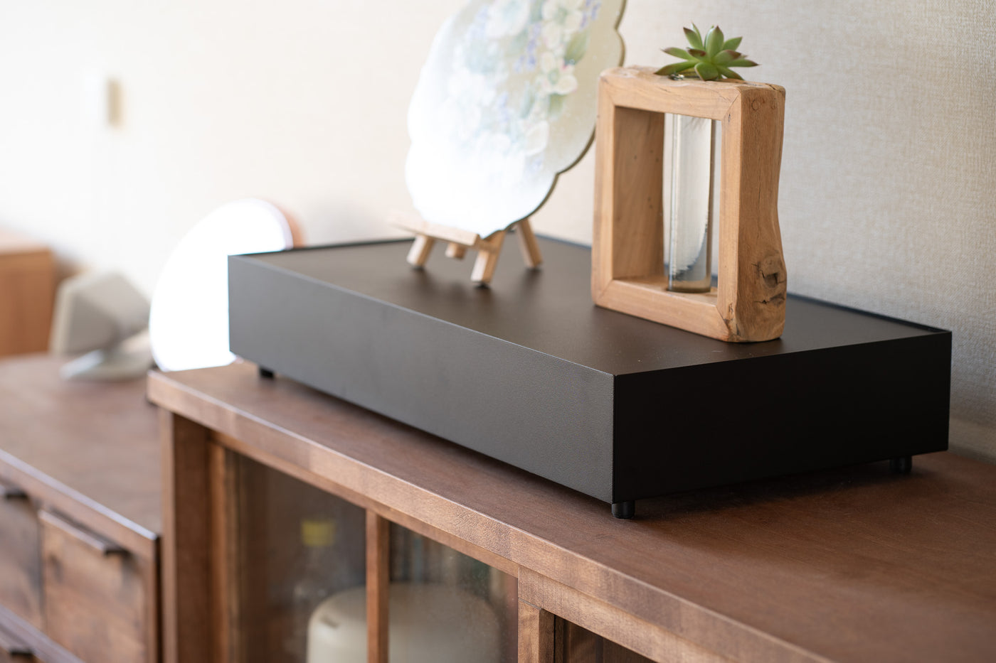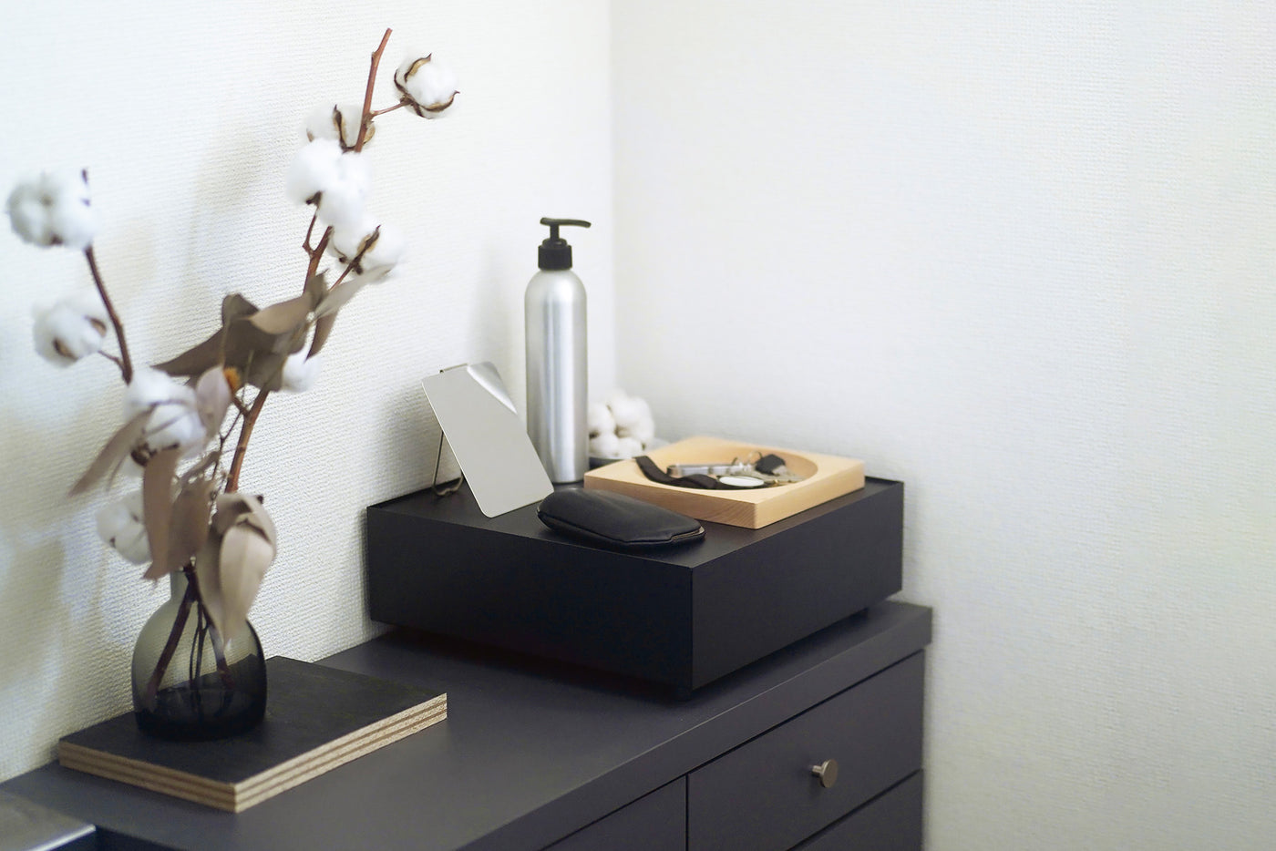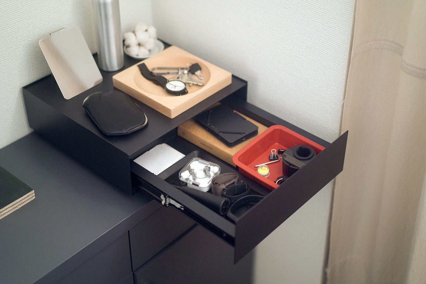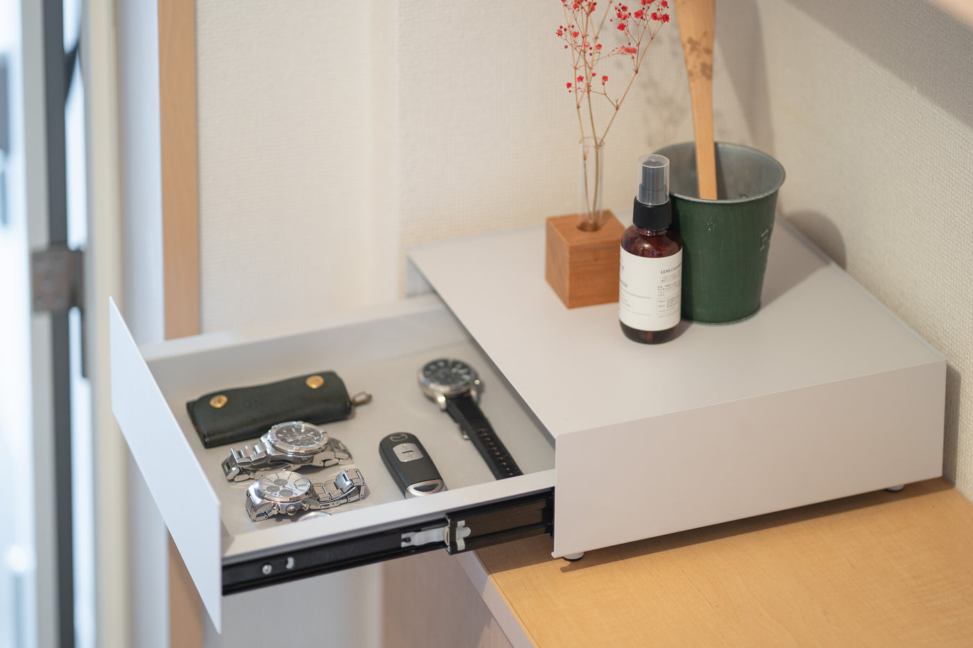 天面にはお気に入りのインテリアをディスプレイ、日常の細々した物は引き出しへ隠して収納。シンプルなデザインが空間に溶け込み、すっきりと整理された印象に。