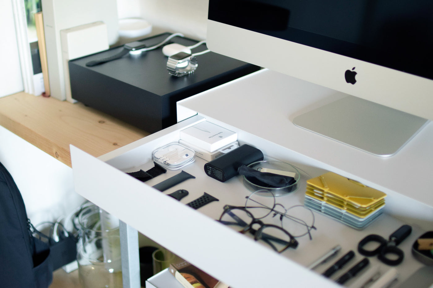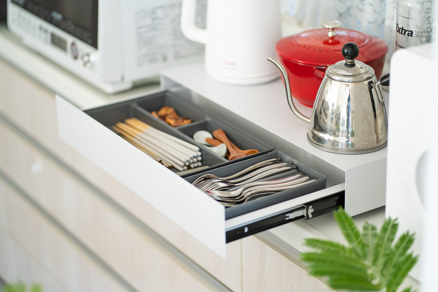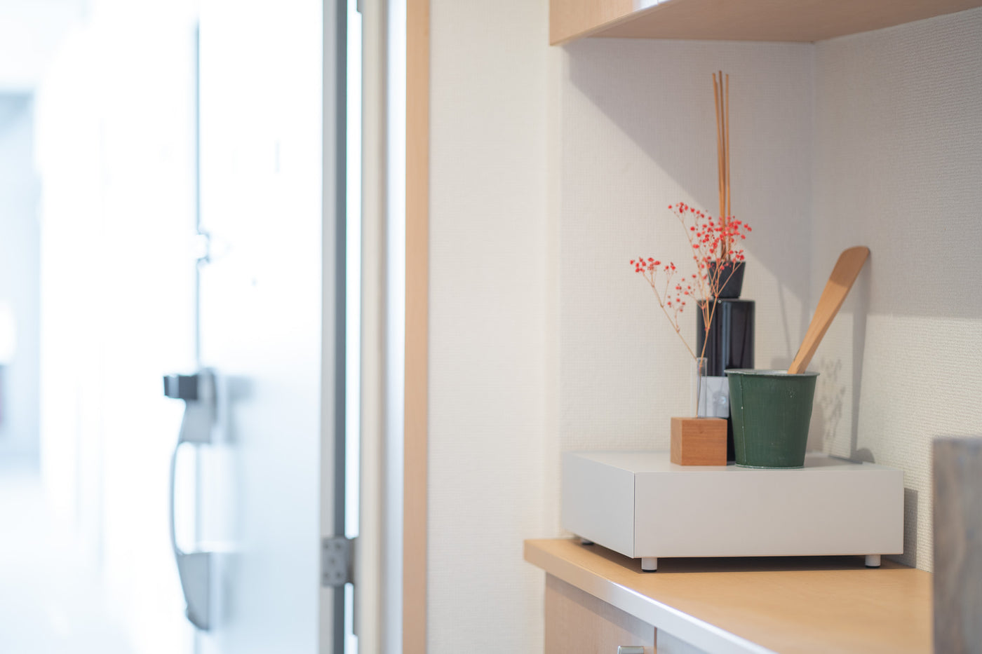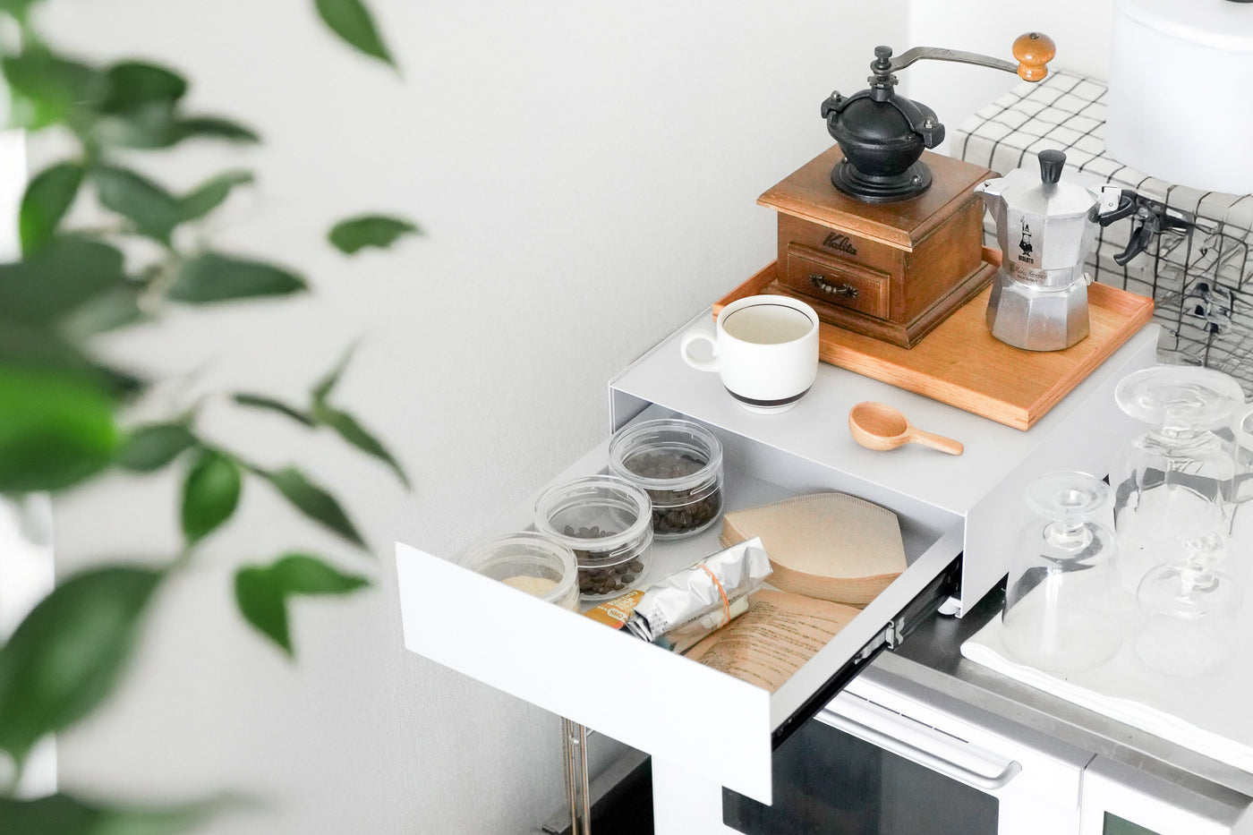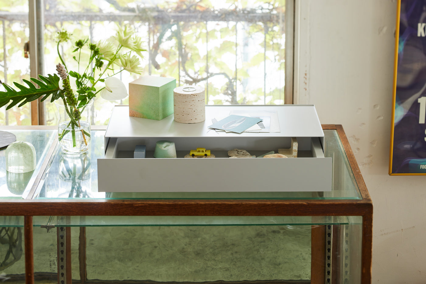 天面にはお気に入りのインテリアをディスプレイ、日常の細々した物は引き出しへ隠して収納。シンプルなデザインが空間に溶け込み、すっきりと整理された印象に。