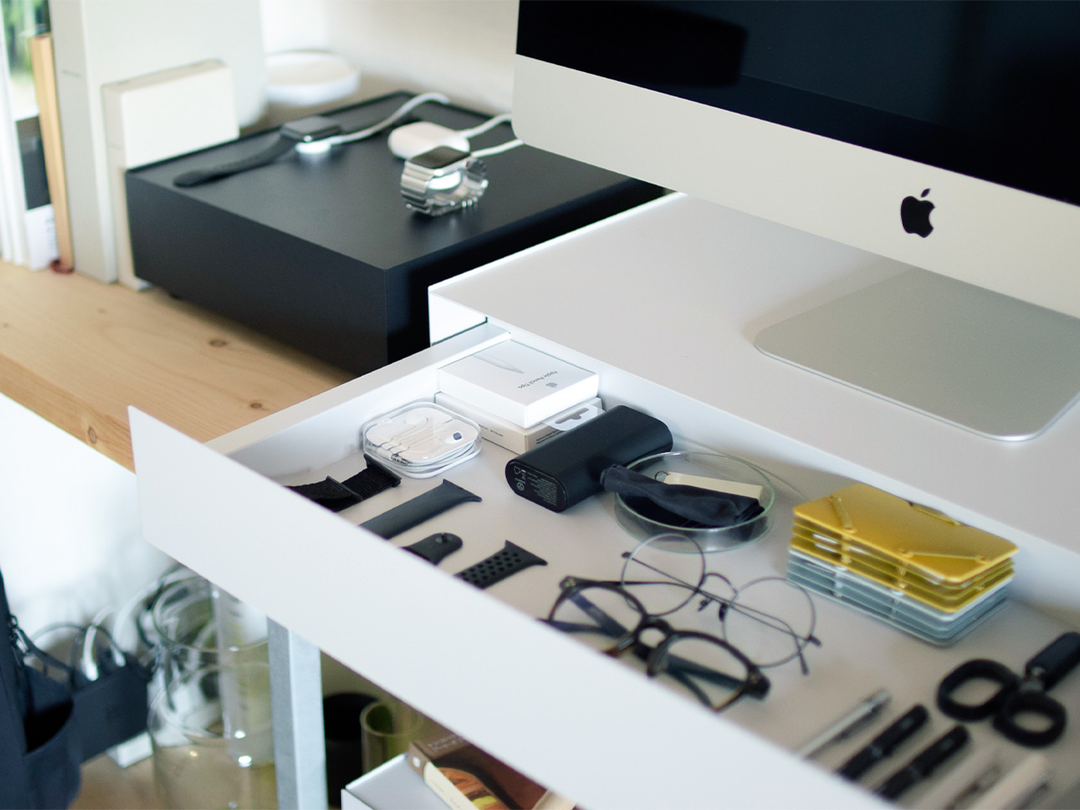 天面にはPCモニター、作業が終わったらキーボードやツールは引き出しへ。仕事がはかどるスマートな作業環境を作り出せます。
