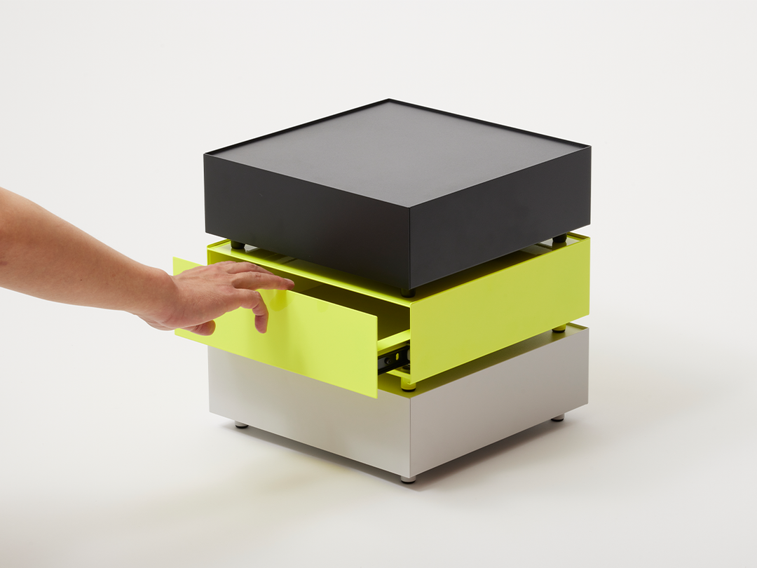 長年の事務用キャビネット製造技術で培ったレールと重量バランスを活かし、するすると動作し、「ましかく」に見える形状を実現しました。